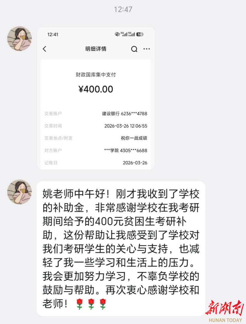 湖南日报3月27日讯(通讯员 唐升 谢红群 姚尽沙) “祝你一战成硕!衡阳师范学院向您的账户存入400元。”近日,衡阳师范学院大四学生曾梅玲在准备考研复试时,收到一条手机短信提示。收到短信后,曾梅玲欣喜地向辅导员分享此刻心情:“这份来自学校的关心和支持,让我奔赴复试的脚步更有力量了。”一句朴实的话语,道出了许多受助学生的心声。