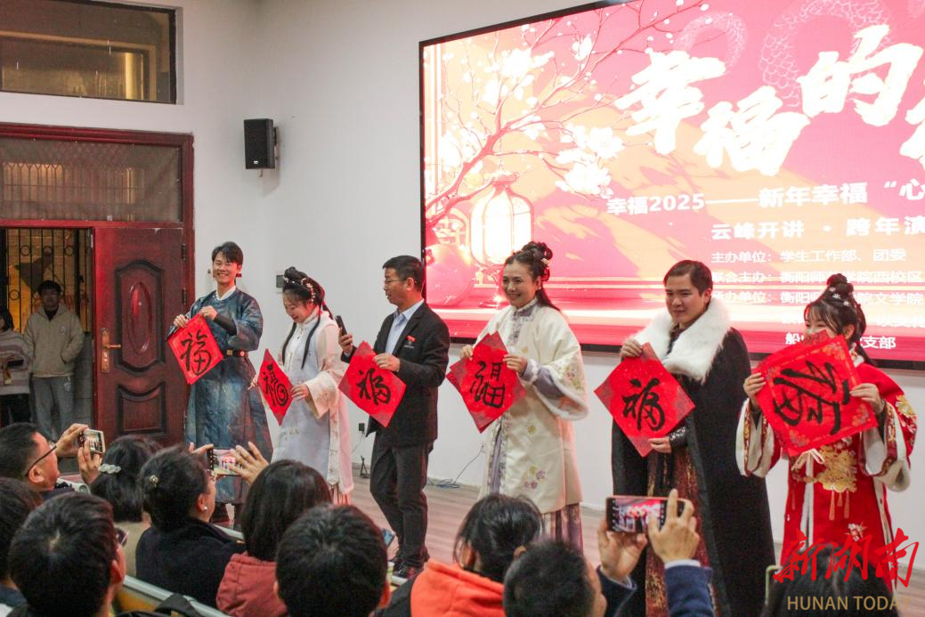 湖南日报·新湖南客户端1月2日讯(通讯员 何颖 谢炎伶 黄静怡 图 周博文)岁序更替,华章日新,为在辞旧迎新之际与青年学生共享“幸福的礼物”,探寻“新年最幸福的打开方式”,12月31日晚,衡阳师范学院文学院举办了第49期津梁讲坛——“幸福的礼物”云峰开讲跨年演讲活动。活动由张云峰老师主讲,三名学生代表和四位嘉宾助阵演讲,为现场200余人和直播中的上千观众带来一场精神的“盛宴”,掀起了一股“幸福的浪潮”。