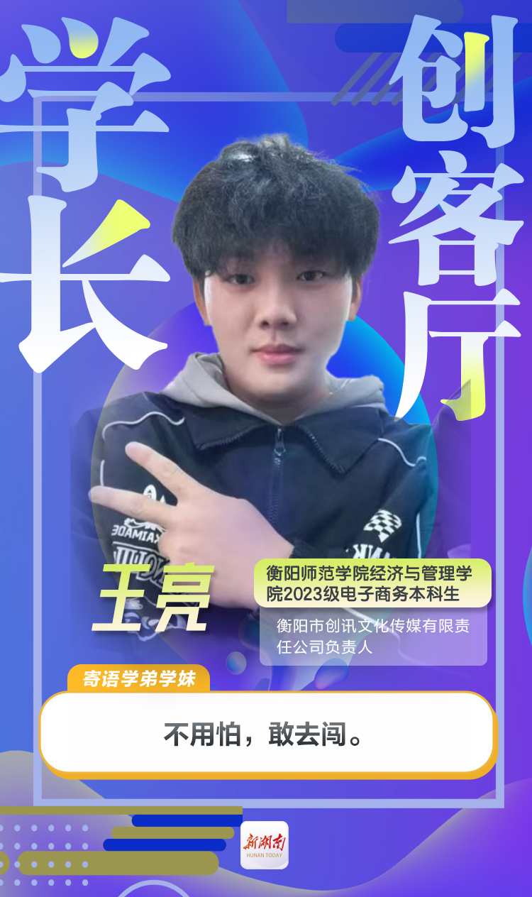 王亮,中共预备党员,衡阳师范学院经济与管理学院2023级电子商务本科生,现为衡阳市创讯文化传媒有限责任公司负责人。他带领同学参与“挑战杯”“互联网+”等赛事,斩获省级奖2项、市校院级奖24项。作为项目负责人,他推动非遗编织技艺与数字经济深度融合,设计原创IP,通过电商直播赋能传统工艺,助力残疾人就业与非遗文化传承。