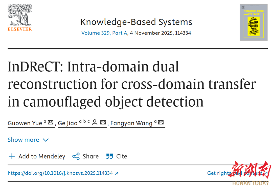 湖南日报·新湖南客户端9月20日讯(通讯员 李婕)近日,衡阳师范学院计算机科学与技术学院电子信息专业2023级硕士研究生乐国文以第一作者身份,在国际人工智能领域顶级期刊《Knowledge-Based Systems》上发表题为“InDReCT: Intra-domain Dual Reconstruction for Cross-domain Transfer in Camouflaged Object Detection”的研究论文。该论文在焦铬教授的指导下完成,衡阳师范学院为第一署名单位。