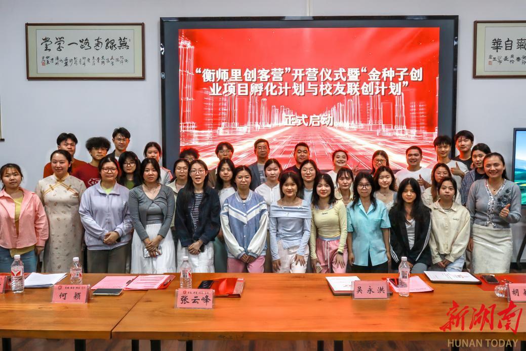 湖南日报·新湖南客户端4月25日讯(通讯员 李子威 图 周博文)为深入贯彻省委、省政府关于支持大学生创新创业“七个一”行动的决策部署,完善创新人才自主培养体系,激发大学生创新创业热情,4月23日晚,衡阳师范学院文学院“衡师里创客营”开营仪式暨“金种子创业项目孵化计划与校友联创计划”启动仪式举行。活动由文学院党总支副书记何颖主持,文学院党总支书记张云峰、创新创业学院院长唐斯萍、校友企业家代表吴永洪、胡颖慧及首批创客营成员各班创业委员等齐聚一堂,共绘青年创新创业蓝图。