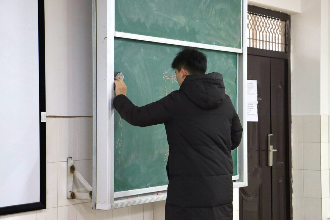 图为同学在教学楼擦拭黑板。中国青年网通讯员 侯仪 供图