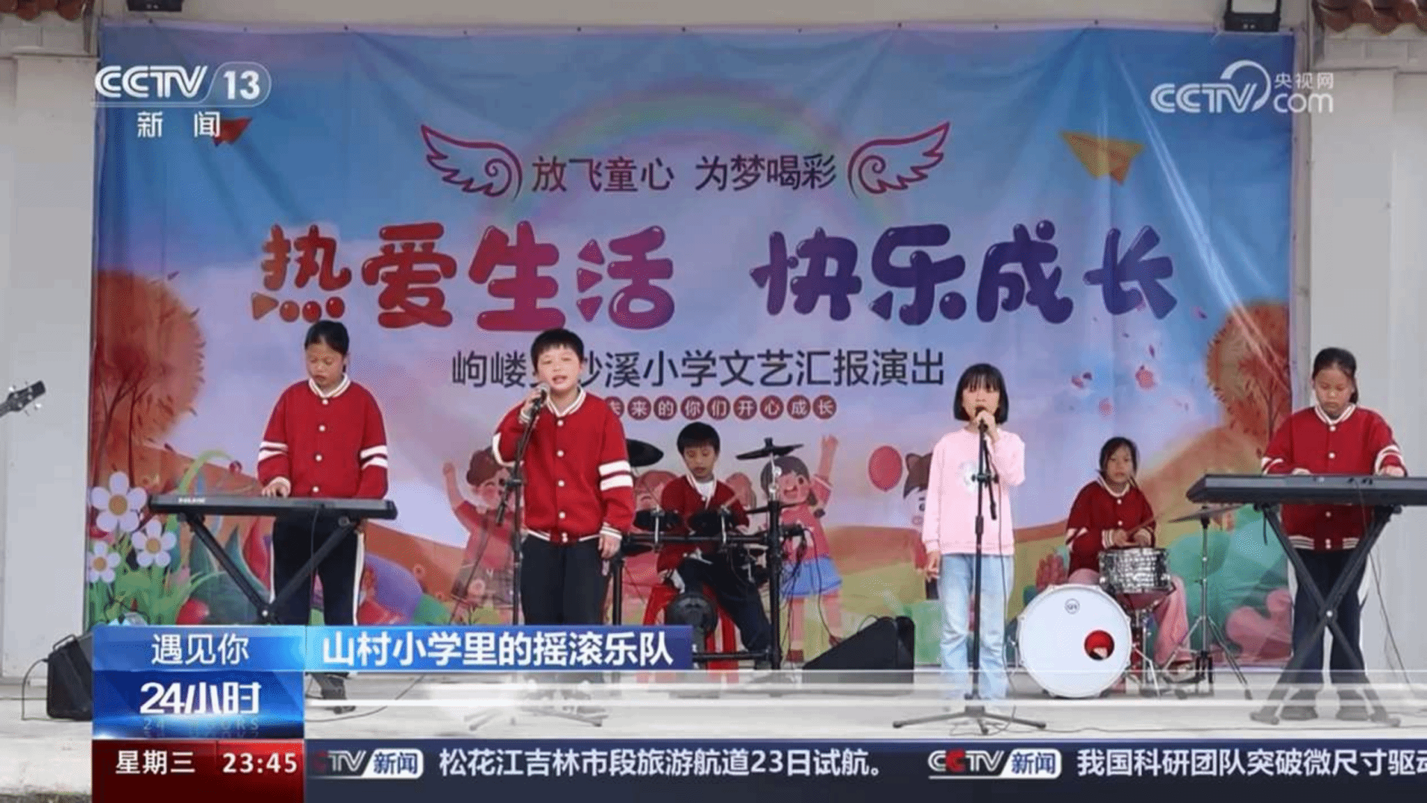 “每当吉他噪声又响起,电流穿过我和你。”音乐声在群山环绕的小学响起。敲打着架子鼓,弹奏着吉他,手持麦克风沉浸地歌唱,这个由8个孩子组成的摇滚乐队自信大方在舞台上表演。宁丹在台下微笑聆听。