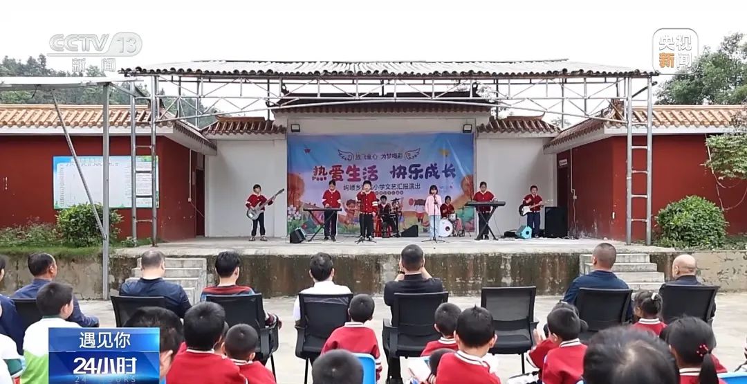 文艺汇演当天,妙溪小学摇滚乐队的孩子们登台亮相,面对台下观看的村民们和参演的外校学生,他们自信地演奏出了精心排练的节目,引来阵阵欢呼。