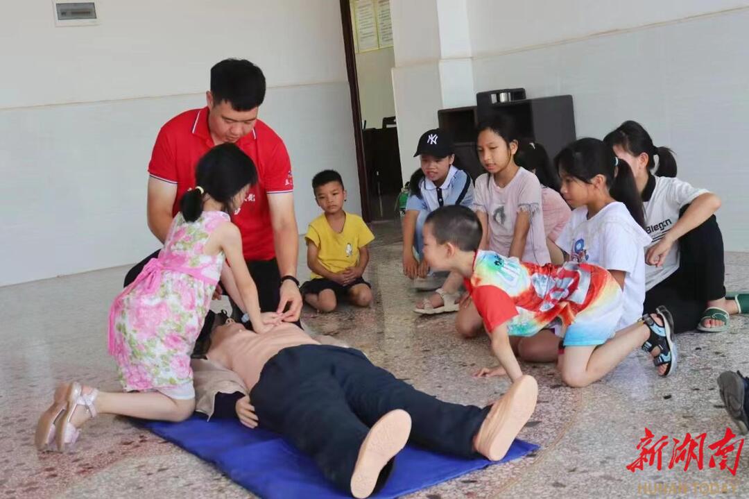 衡阳师范学院大学生生存训练与安全教育工作室的志愿者给小朋友们进行了心肺复苏和海姆立克急救的示范教学。志愿者们首先讲解了心肺复苏的原理,通过心肺复苏的假人模具展示施救方法,在按压的时候应该双臂伸直,垂直向下用力按压,频率为每分钟按压100次到120次,按压深度成年人为5-6厘米,儿童为3-4厘米。
