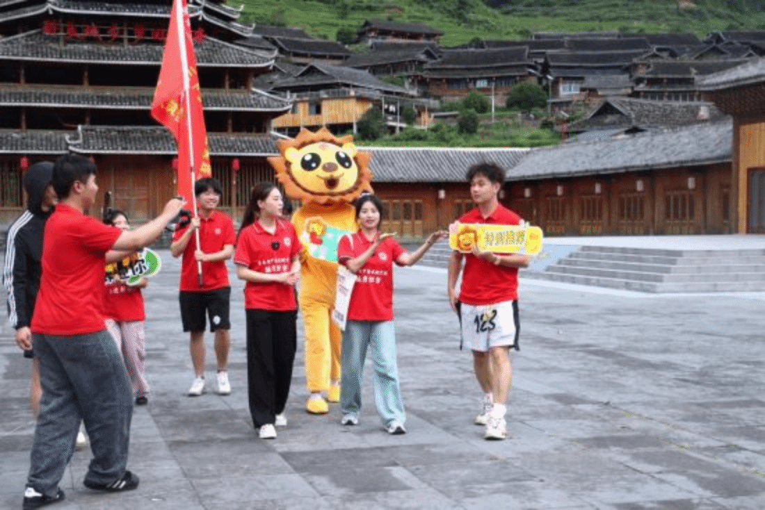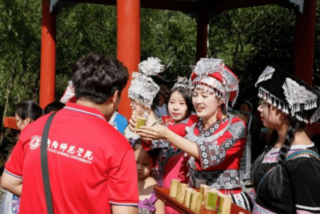 侗族人民热情好客,当有远方客人来访时,侗族姑娘们会身着盛装、载歌载舞,手持酒碗在寨门口一字排开。客人要想进入寨子,就必须先喝下姑娘们递上的美酒,营造出欢乐、祥和的氛围。直播的最后,实践团成员带领观众体验了当地的“拦门酒”习俗。