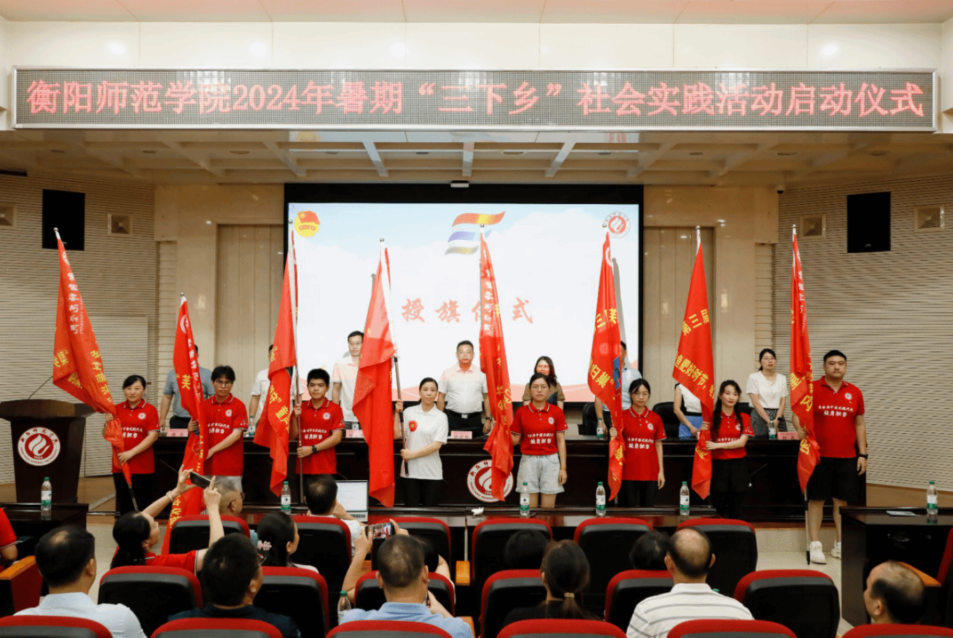 与会领导为校主队、各学院院队、七彩假期全国项目团队、“芙蓉学子乡村振兴”项目团队等授旗。旗帜在双手间传递,飘扬如火炬,全体起立许下铮铮青春誓言。