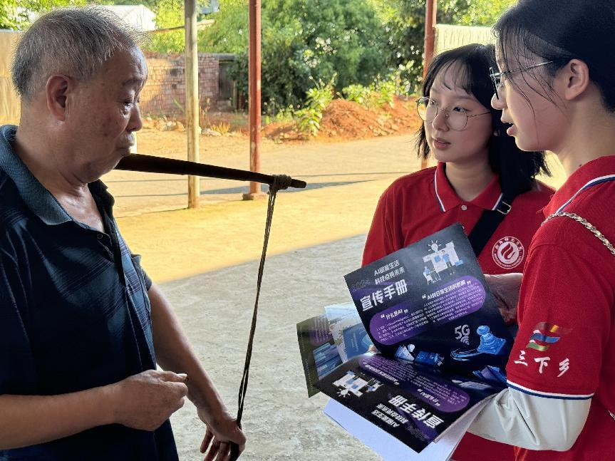 实践团成员为当地居民发放AI宣传手册并进行深入调研。