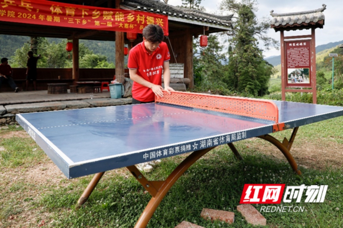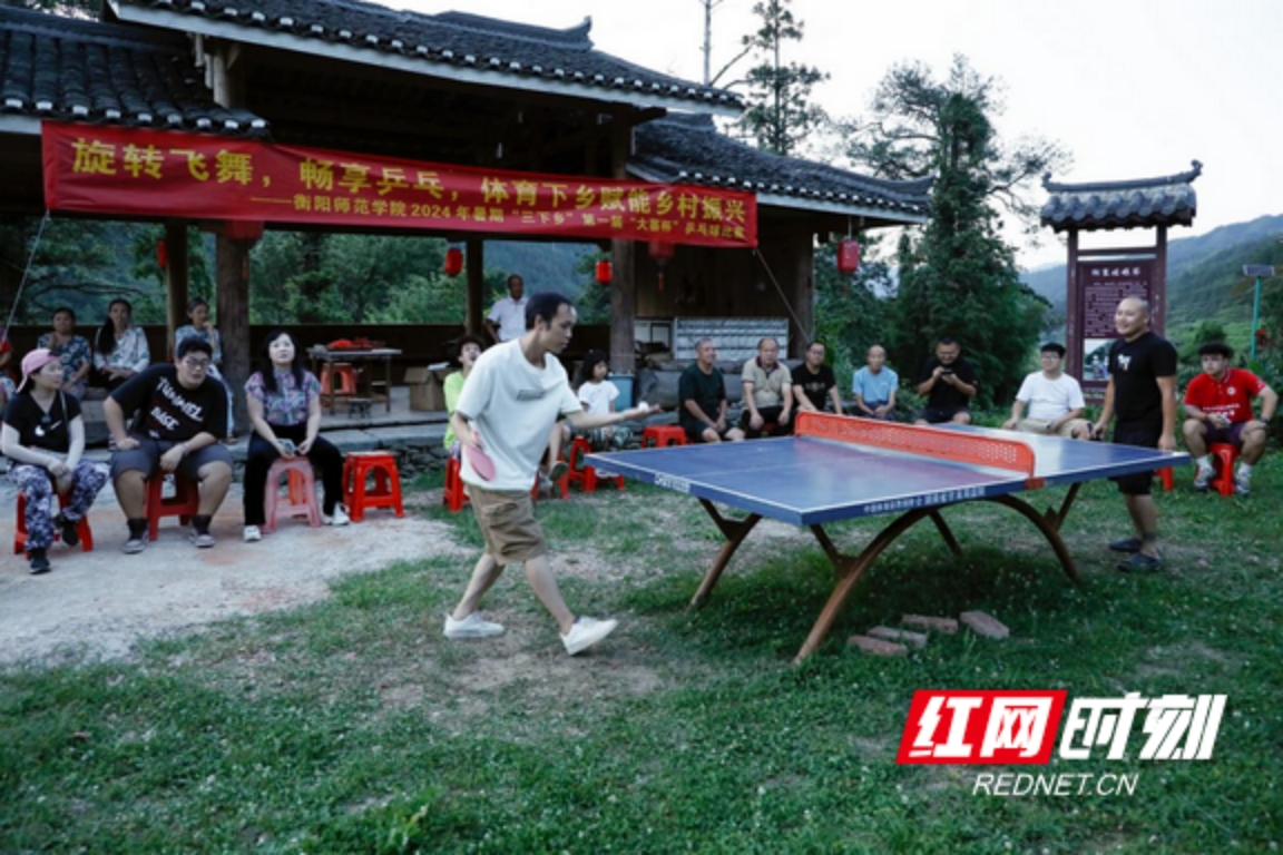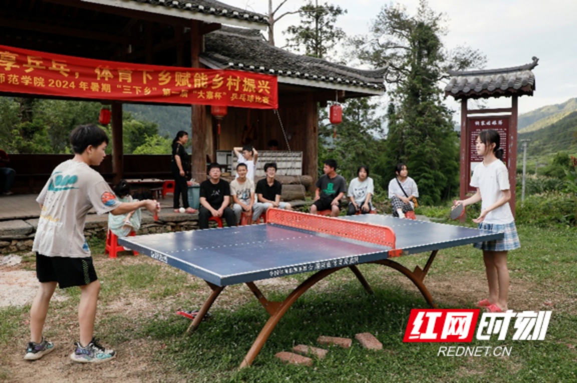 红网时刻新闻7月23日讯(通讯员 魏菲菲 肖贝琳 郭晶晶)“好球!”“反扣球!”侗寨大山里传出了打球的欢笑声。7月17日,湖南衡阳师范学院“星火筑梦”乡村振兴实践团与邵阳市城步苗族自治县长安营镇大寨社区的村民们在大寨老鼓楼草坪中央,开展了一场为期2天的“村TT”比赛(乡村Table Tennis,简称“村TT”)。